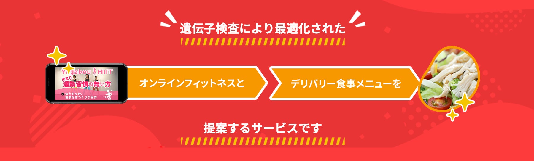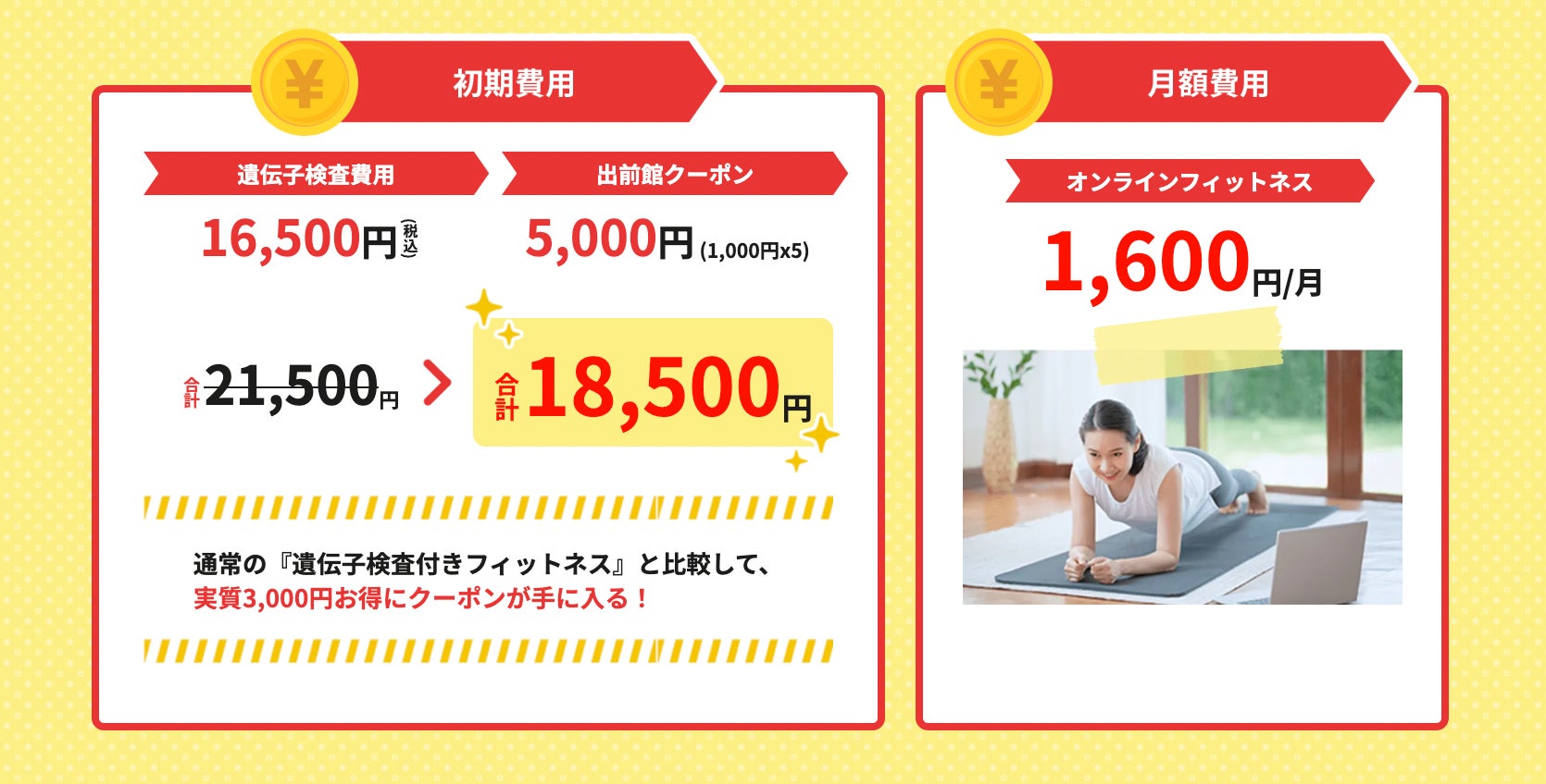 「運動と食事をセットで管理したい」という更なる利用者の声に応える流れで本キャンペーンに至りました。 3つの特長①遺伝子検査をもとにしたアナタに最適なメニュー  ②忙しいアナタにピッタリ!運動も食事も時短で解決  ③意外!デリバリーなのにフィットネスに効果的なメニュー提供  実質3,000円お得に買える!出前館の5,000円クーポン特典「個人向けに遺伝子検査付きオンラインラインフィットネス」とのセットで、通常5,000円かかるクーポンが3,000円もお得に手に入ります。継続縛りもないので、安心安全で活用できます。  今すぐ!申し込みはコチラ↓