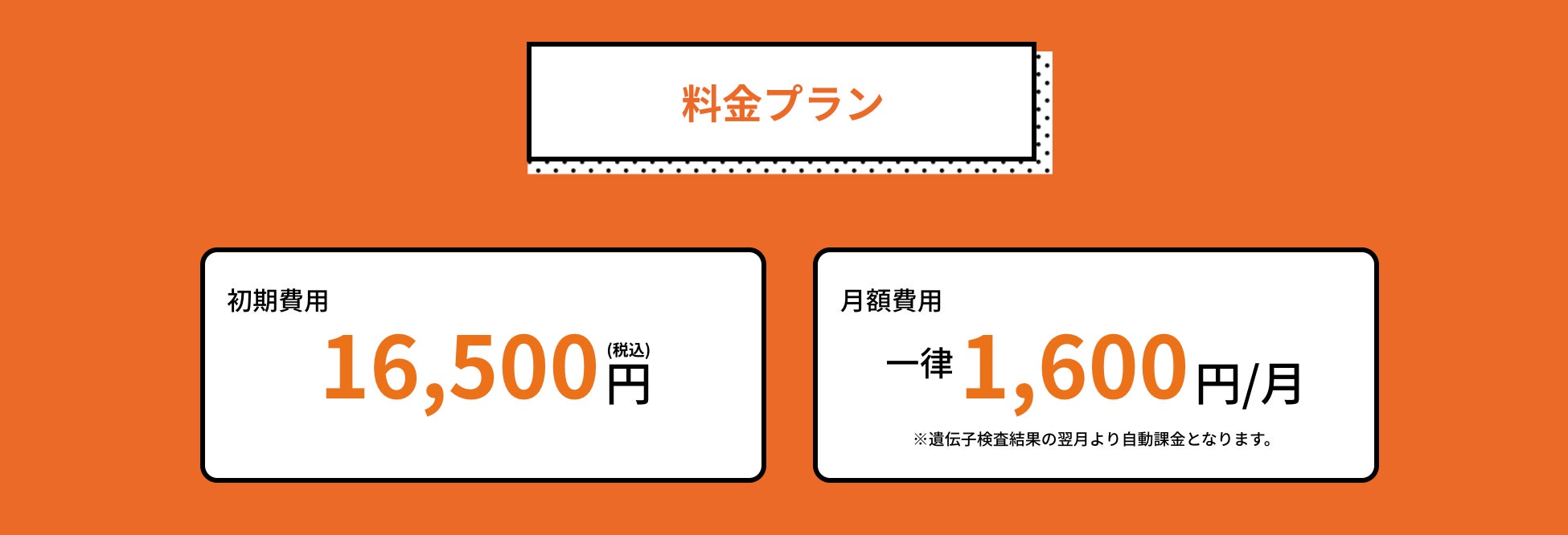 最後に、講座に関わらず月額の利用料金は一律1,600円。遺伝⼦検査キットを含めた初期費用もメーカー希望⼩売価格 33,000円(税込)の 半額16,500円(税込)にて提供します!