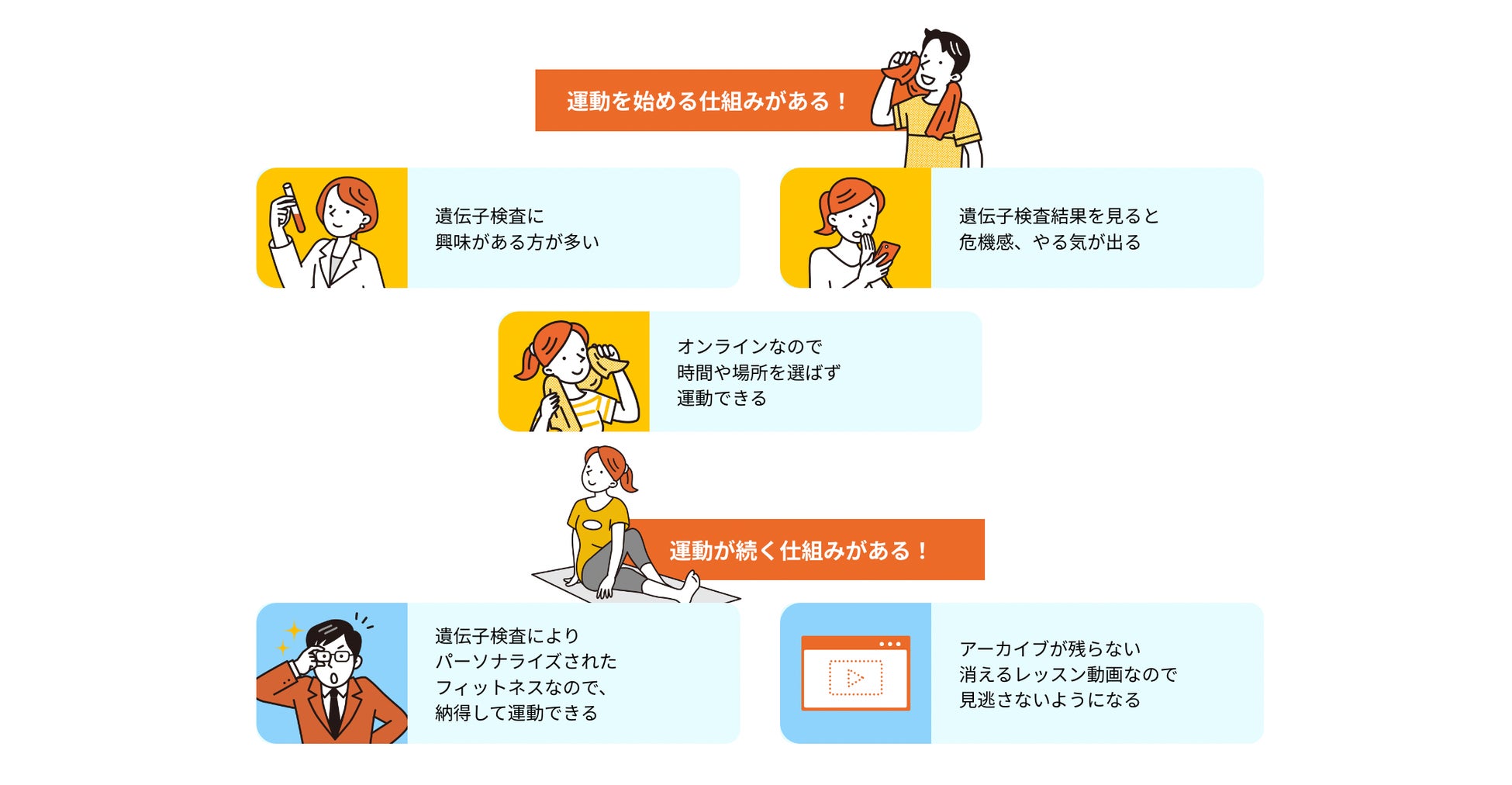 遺伝子検査付きBeneFitness』は、2つの仕組みで「始めるキッカケ」「続ける理由」を創出します。